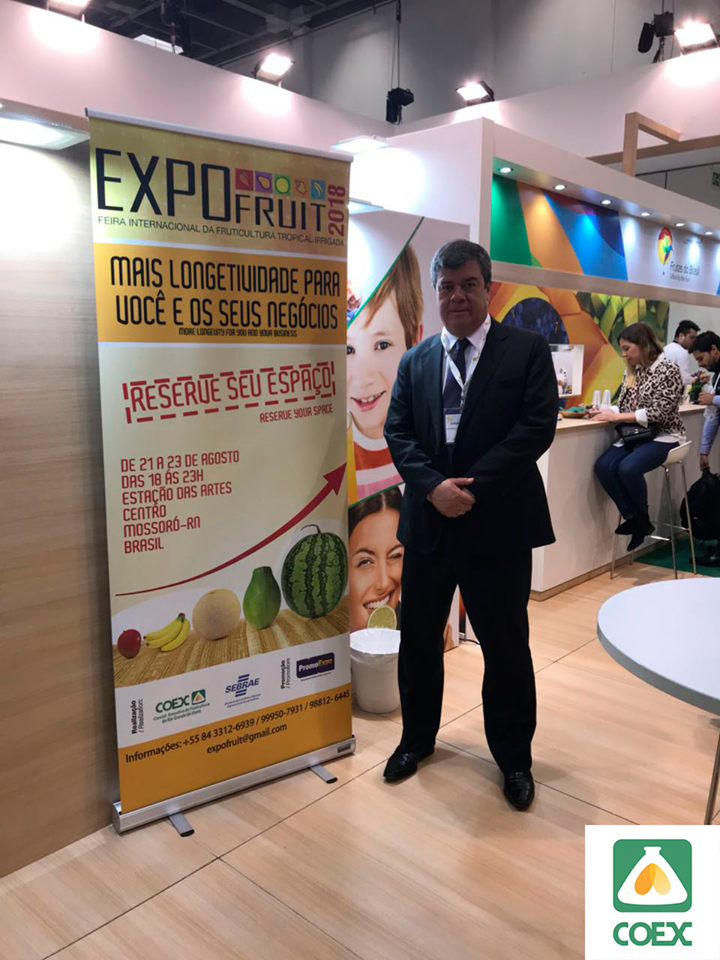 Luiz Roberto, Presidente do COEX-RN, divulga a data para a Expofruit 2018 no stand da #FrutasDoBrasil durante a Fruit Logística. A Expofruit – Feira Internacional da Fruticultura Irrigada – possui uma mostra de frutas produzidas em todo o estado, com destaque para as regiões do Oeste e do Vale do Assú. É considerada a feira de fruticultura tropical mais importante do país e que conquistou a atenção de grandes investidores e exportadores, responsáveis por levar grande parte da produção frutícola para diversos locais do mundo. Estará ocorrendo entre os dias 21 a 23 de Agosto em Mossoró-RN.